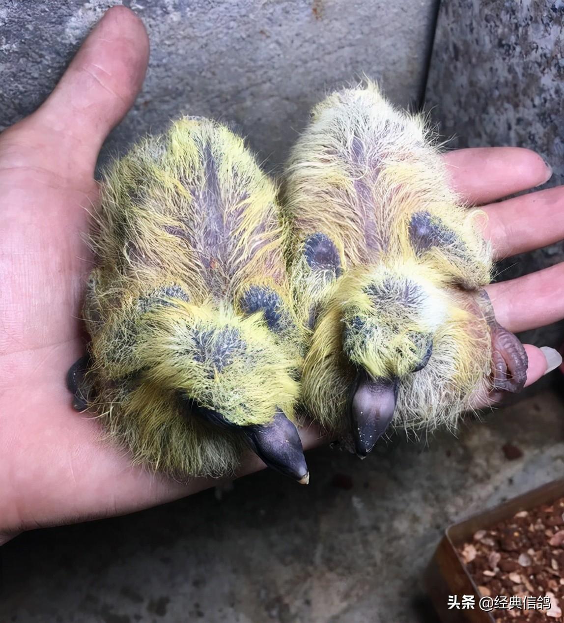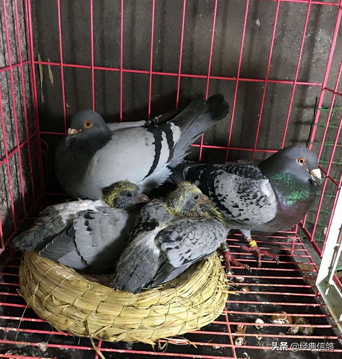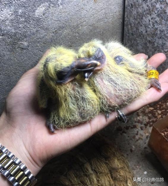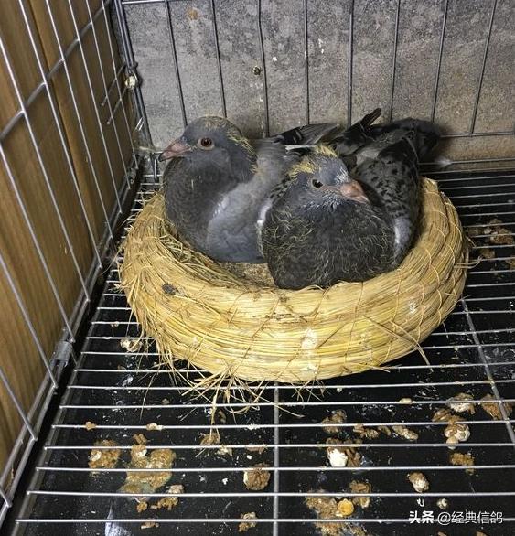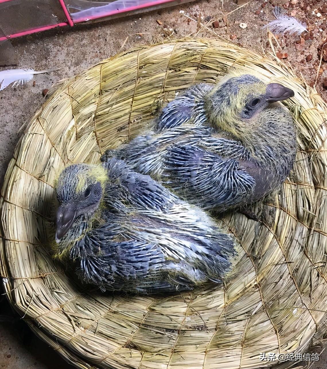 大的蛋是雄,小的蛋是雌,特地给蛋做了标记,方便以后验证,早上先出壳的是雌鸽,中午出壳的雄鸽。