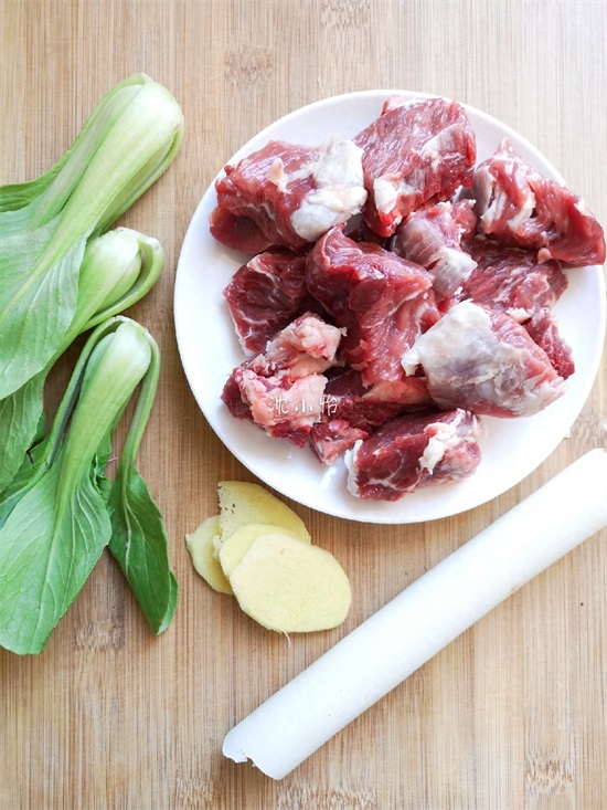 食材:牛腩300克、生姜5片、大葱1/2段、小青菜3颗、手擀面400克