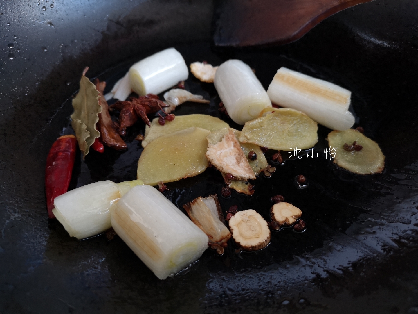 2、生姜去皮,切成片,大葱切成葱段,锅里倒油,油热后放入生姜片和大葱段进行煸香,然后再放入八角、桂皮、香叶、陈皮、白芷、干辣椒和花椒进行爆香,把所有煸炒后的香料装进过滤袋中。