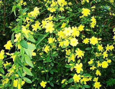 迎春花:别名迎春、黄素馨、金腰带,落叶灌木丛生。株高30-100厘米。小枝细长直立或拱形下垂,呈纷披状。3小叶复叶交互对生,叶卵形至矩圆形。花单生在去年生的枝条上,先于叶开放,有清香,金黄色,外染红晕,花期2-4月。因其在百花之中开花最早,花后即迎来百花齐放的春天而得名。 迎春花与梅花、水仙和山茶花统称为“雪中四友”,是中国常见的花卉之一。迎春花不仅花色端庄秀丽,气质非凡,具有不畏寒威,不择风土,适应性强的特点,历来为人们所喜爱。迎春花栽培历史1000余年,唐代白居易诗《代迎春花召刘郎中》以及宋代韩琦《中书东厅迎春》和明代周文华撰《汝南圃史》均有记载,迎春花现在为河南省鹤壁市的市花。
