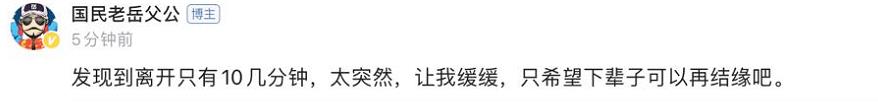 “撕家”从抽搐到离开全程只有十几分钟,非常突然。作为主人的“国民老岳父公”很难接受,需要时间来缓解内心的伤痛,还希望下辈子能与“撕家”再结缘。