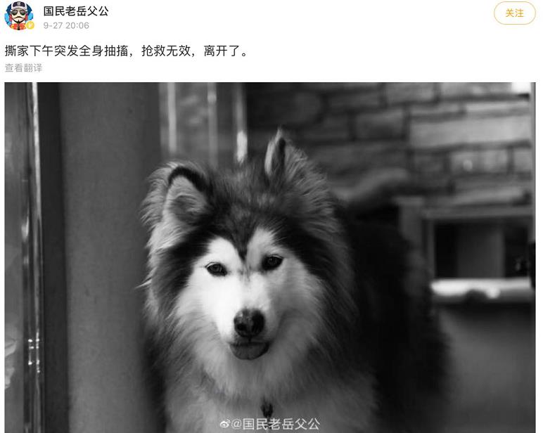9月27日,千万粉网红“国民老岳父公”在社交平台上宣布爱狗“撕家”去世,事发突然,令人悲痛。