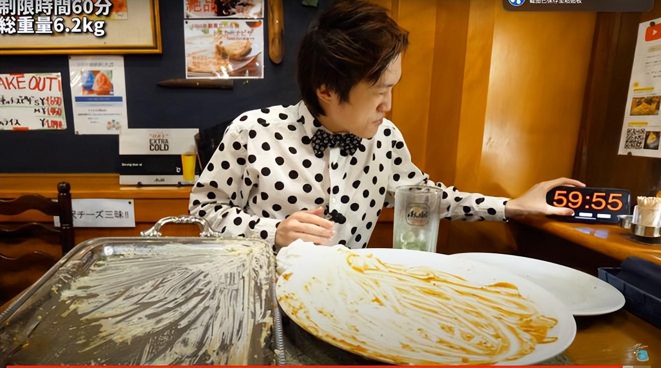 最终花费了55分22秒的时间吃完,我看他的身体最后都一直在颤抖 了。因为吃完如此多的食物,是必须喝下大量的水,把胃给撑开的,身体负担很大。