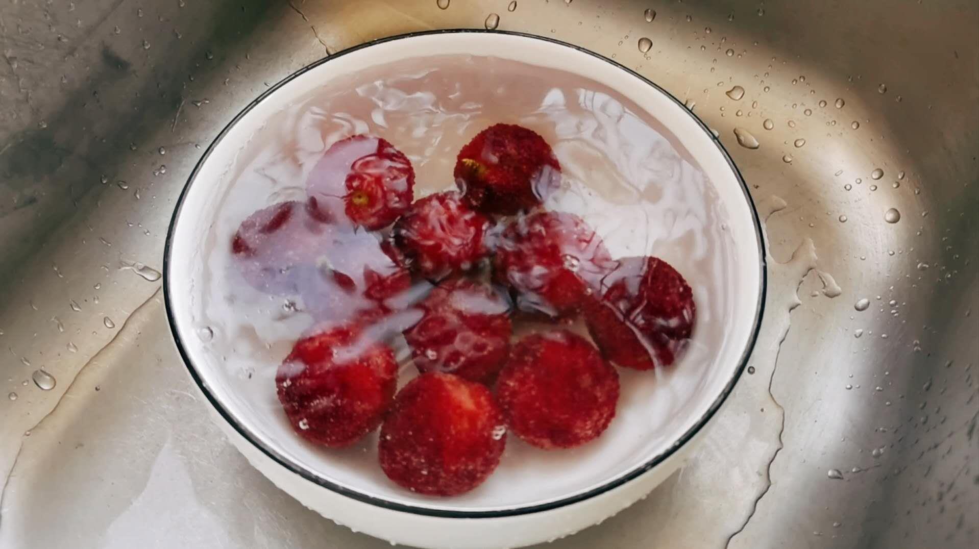 第一步:杨梅清洗干净,装入大盆,,放一勺小苏打粉,加满水,浸泡半小时后,捞出沥干水分;