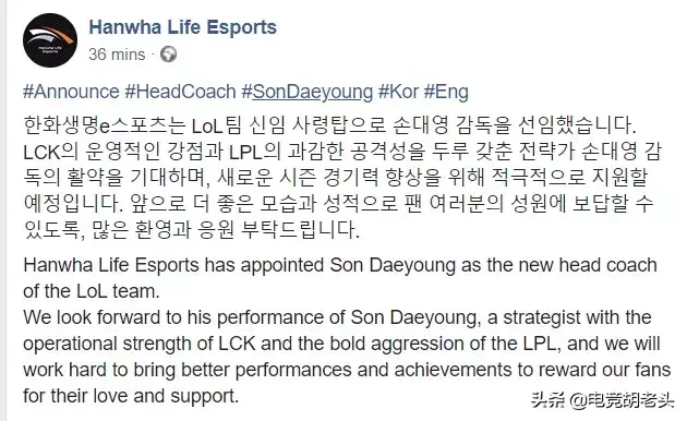 “韩华电子竞技俱乐部已经正式任命孙大勇为英雄联盟团队的新任主教练。