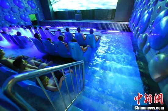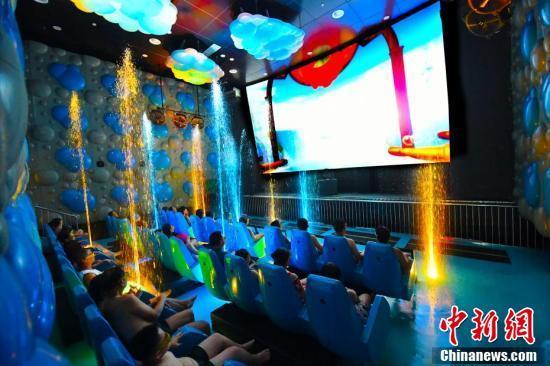 8月3日,观众在广州融创水世界感受水中观影体验项目--4D水影院。该影院引入造浪和瀑布特效,让观众真切感受到影片中的大浪、风暴、雷电、下雨、水雾等情景,形成一种身临其境的错觉。他们坐上特制的座椅戴上4D眼镜,伴随着影片的进行,时而是水上滑梯,时而是丛林历险,时而要躲避海盗的厮杀,最惊险刺激的便是突然从水中蹿出一条巨蟒,身下的座椅也渐渐被涌出来的水淹没,虽然明知道这只是4D效果,但仍然会被其如同冲出荧幕般的真实而震撼。