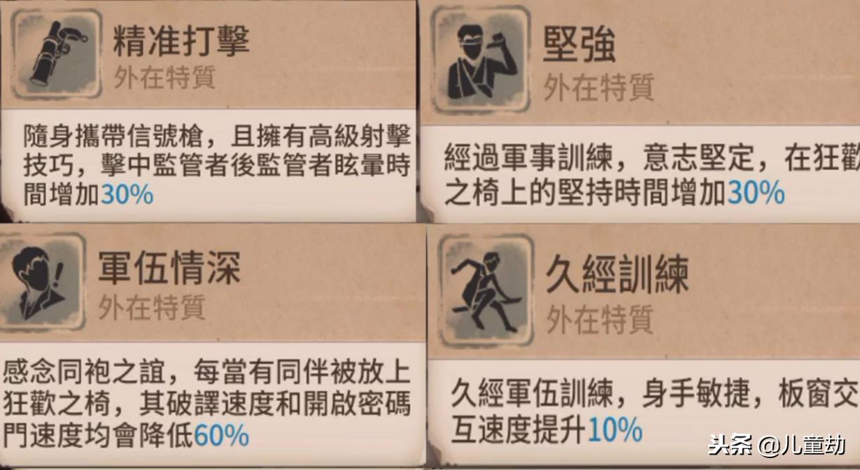 (3)军伍情深:感念同袍之谊,有同伴上椅-60%的破译速度。这特质很明显告诉我们,当队友上椅你他X的别想破译阿!快去救你的队友!