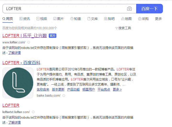 在这里推荐用电脑端操作,据说有些手机浏览器登录不了找回页面,首先搜索关键词“LOFTER”,出来的是网易公司旗下的一个也算是博客类型的网站,选择带有官方的链接点进去。