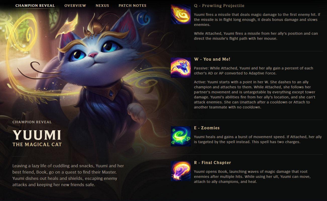 LOL有第144位英雄魔法猫咪悠米,其相关的完整技能效果和具体英雄形象在近日终于正式公开了,一起来看看具体的技能解读吧。