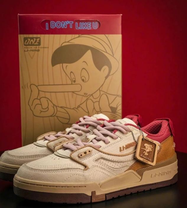 它整体的鞋面都是皮革,白棕红的配色很高级,鞋面拼接、鞋上的扣子和金属螺丝的设计,使得这双鞋像是木偶,和“匹诺曹”的主题很搭。鞋盒上“I DON’T LIKE U”和匹诺曹变长的鼻子,寓意很有趣,同时,这也鞋跟后的字母做了呼应。这双鞋子真的好看呀,送女友也好
