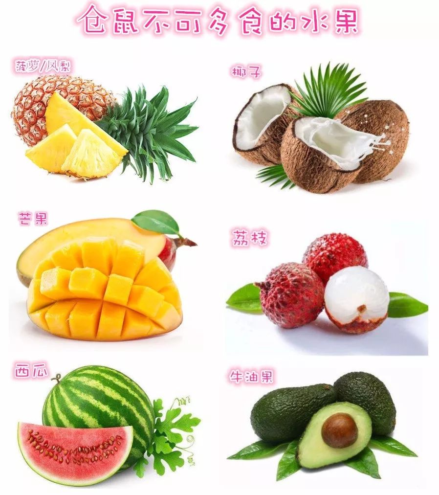下面是些仓鼠不可多吃的水果,这些水果主要是水分含量太高,仓鼠吃多了容易拉稀。其中椰子脂肪含量过高,不适宜多吃。牛油果多吃对肝脏有一定的损害。芒果过多食用会引起食欲不振,四肢无力。