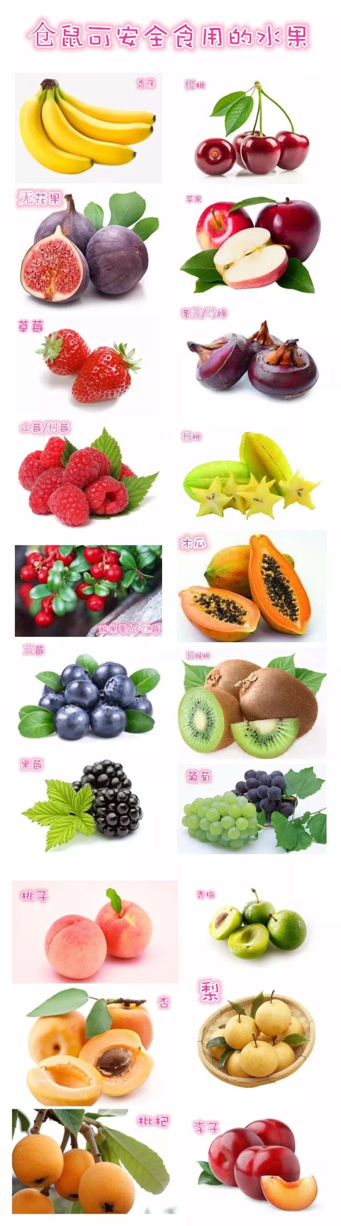 除了主粮,仓鼠平时也爱吃些零食果蔬的。下面小豚依旧贴心的奉上仓鼠可食用水果种类图,提句废话,给仓鼠喂水果一定是去籽!去籽!去籽!