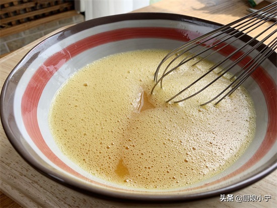 3、然后将碱水与鸡蛋液混合,用蛋抽顺着一个方向搅打到均匀,慢慢的可以看到碗中的蛋液变成深黄色。