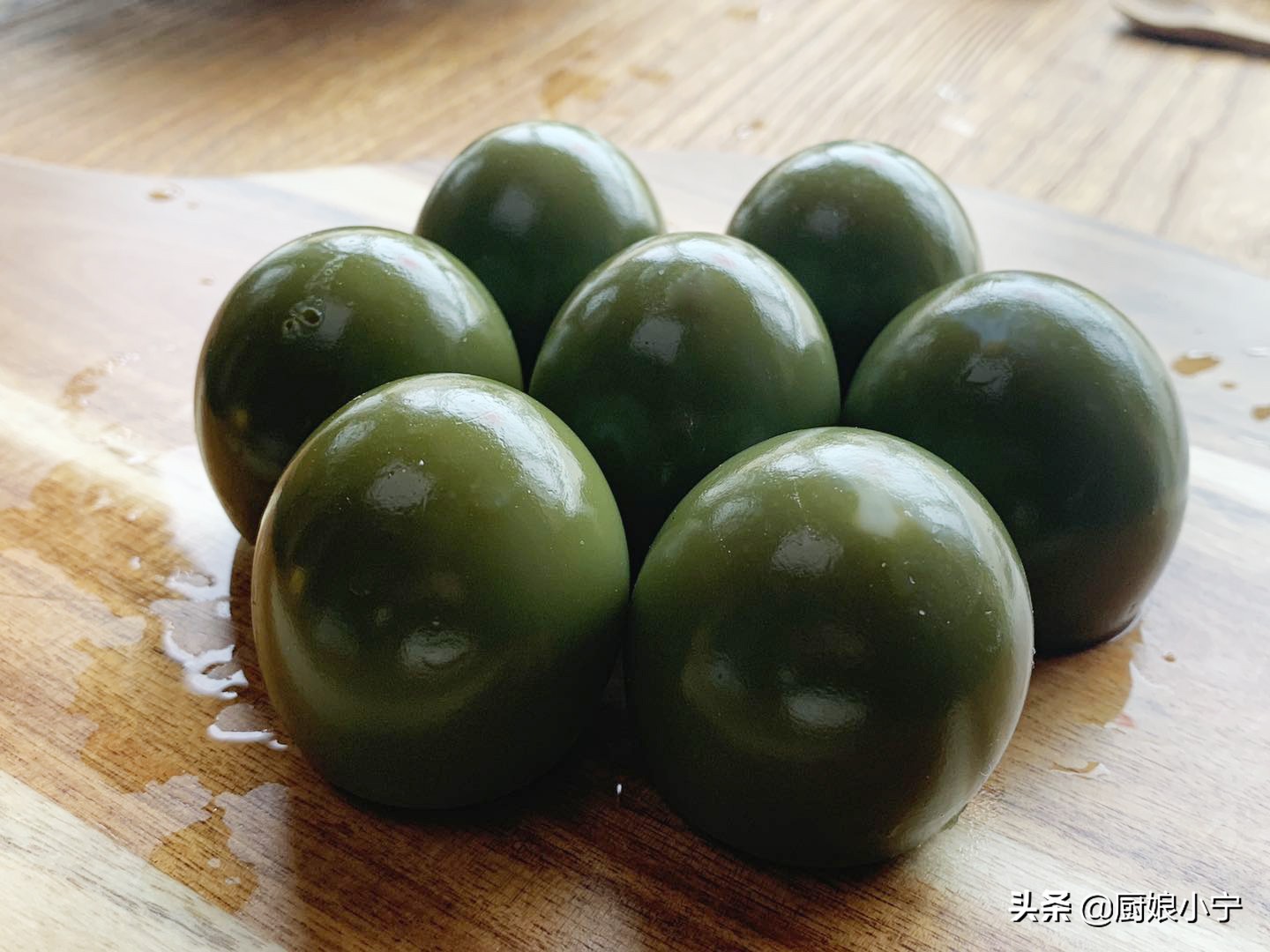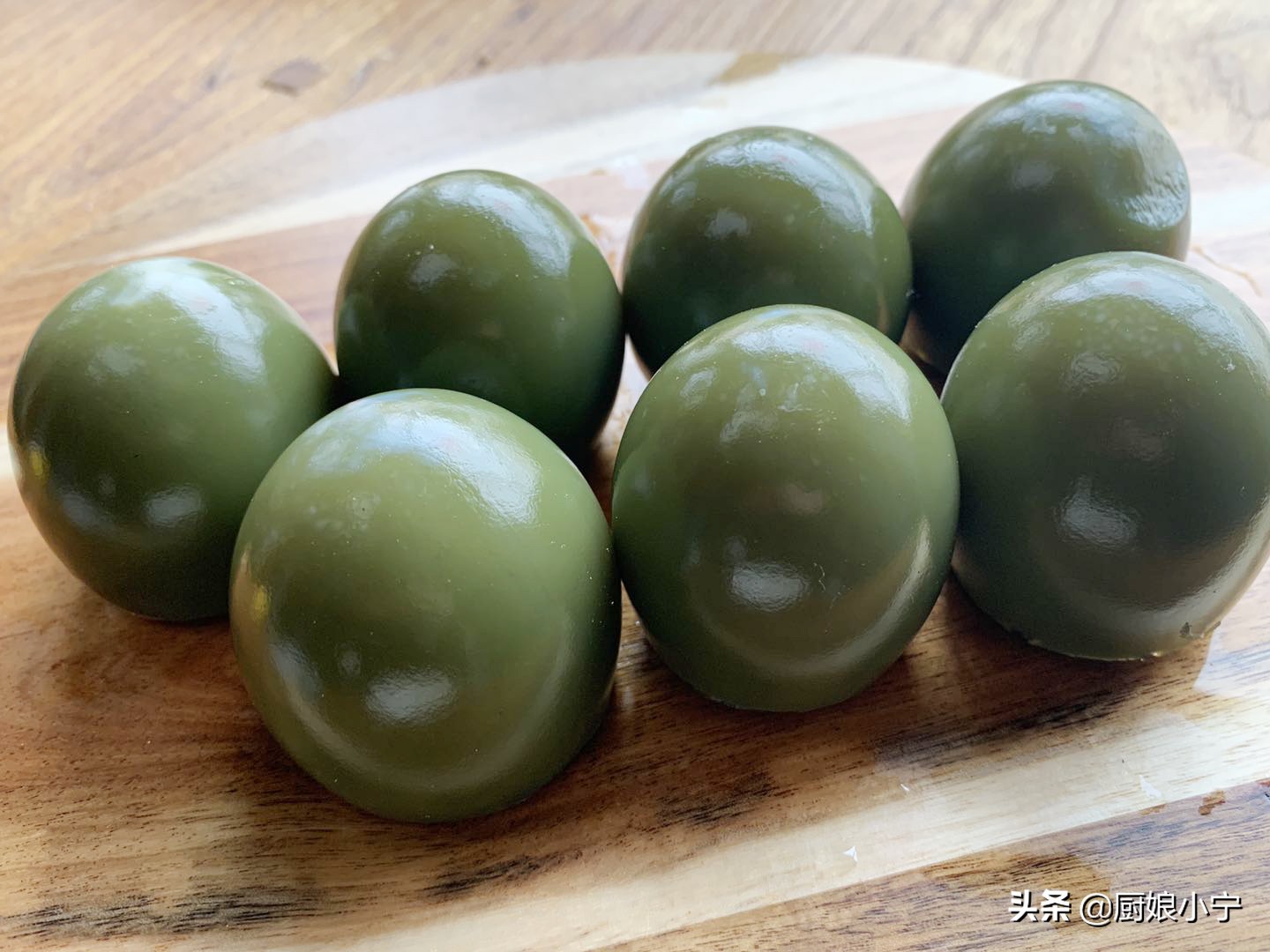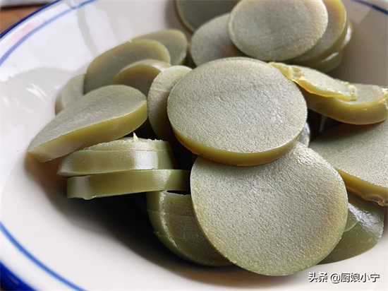 7、蒸好后的实蛋去掉外皮Q弹可爱,看着有满满的胶原蛋白,因为鸡蛋遇到碱水会变成绿色,所以颜色亮丽,口感是微微的碱香,然后将实蛋改刀切成片