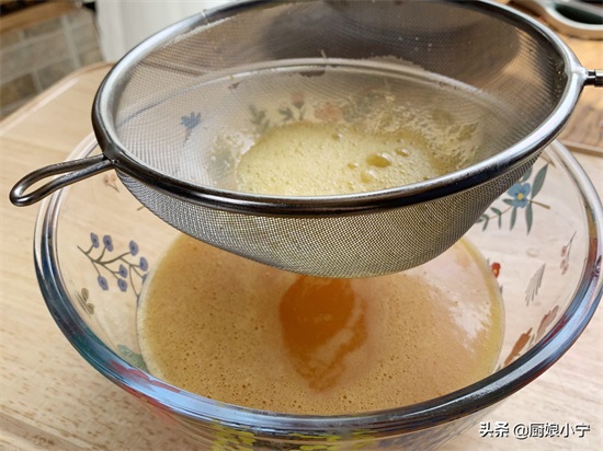 4、将搅拌好的蛋液过滤一下,过滤出没有混合均匀的蛋清、泡沫和难免混合进去的碎蛋皮