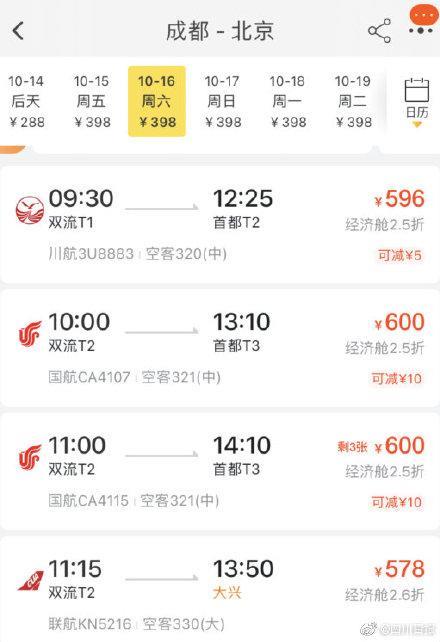 过完国庆黄金周假期,国内机票价格呈现大面积“跳水”现象,部分航线的最低机票价格仅为同一目的地高铁票价的一半,比如,本周末成都飞北京的机票价格在600左右、成都飞上海的价格低至430元。(成都日报)
