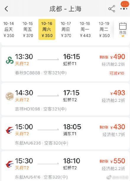 成都飞北京上海机票白菜价 比高铁票便宜一半