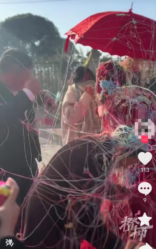 在后续上传的婚礼迎亲视频中,可以看到穿着大红色中式礼服的新娘从车上下来,起初还笑逐颜开,但之后就被彩带喷得满头满脸。新娘捂着脸躲进新郎怀里。这时,她的头发上已经在冒烟。