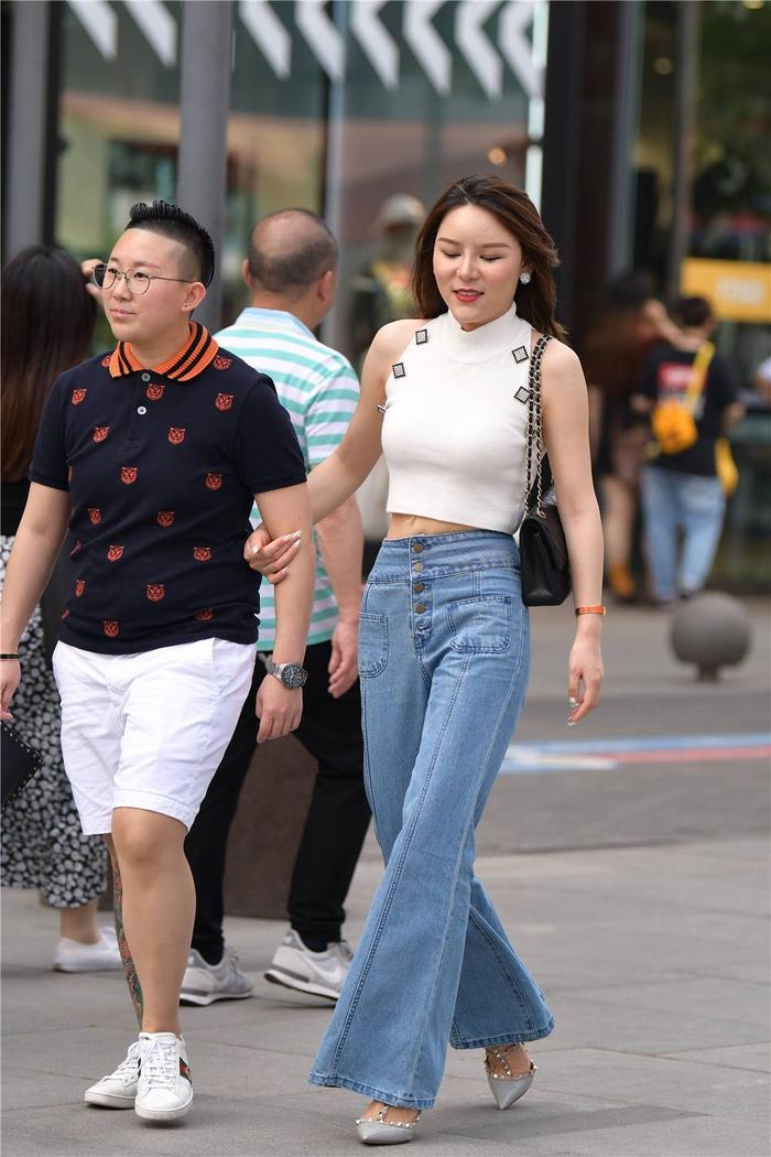 生活中的美女,知道怎么搭配,她们也会尝试各种风格,这位美女选择浅蓝色的尖头细跟铆钉凉鞋,看不出鞋跟的高度,但是很好衬托身材,搭配蓝色的喇叭牛仔裤,很宽松的款式,很舒服的搭配,前面一排扣子点缀,增加层次感,也显得很大气,裤子的缝合线比较多一些,也起到了点缀效果,一件白色的高领修身小衫,无袖的款式,衬托身材曲线,也显得很带去,黑色单肩包,也是很舒服的搭配。