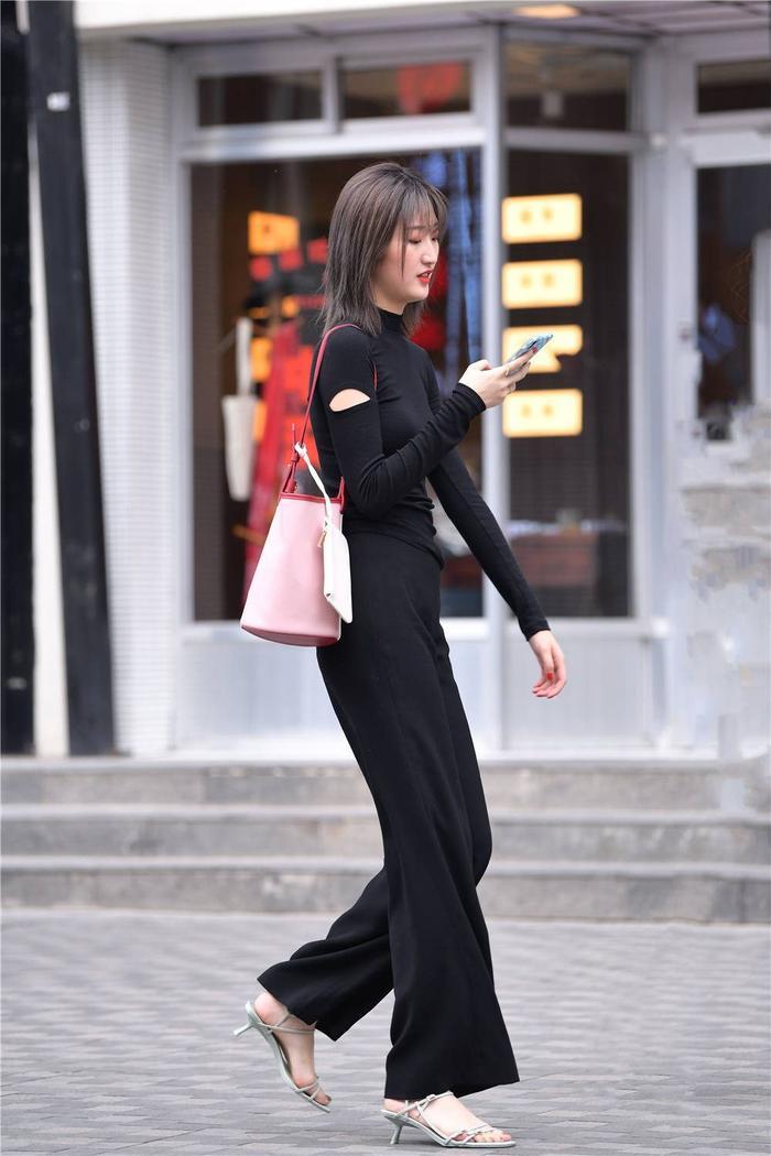 好多人很喜欢搭配,也穿出不一样的感觉,这位美女选择的搭配很简单,一双浅色的细跟凉鞋,纤细的鞋带设计,增加层次感,也显得很特别,搭配出不一样的感觉,如果你也喜欢搭配,可以尝试,鞋跟不高,简简单单,美女搭配黑色的阔腿裤,身材高挑匀称,应该是魔塔,黑色的长袖修身小衫,高领的款式,很舒服,也很低调的搭配,浅粉色的单肩包,真皮的款式,也是很舒服的搭配。