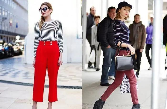 ♦高级时装范的穿搭,简单的黑白条纹T选搭红色阔腿裤,选择黑色的包包和鞋子组合,气质的出街造型。还有就是深紫条纹T和红色紧身裤搭配,黑色的小挎包和短靴搭配,身材高挑的小仙女推荐借鉴造型。
