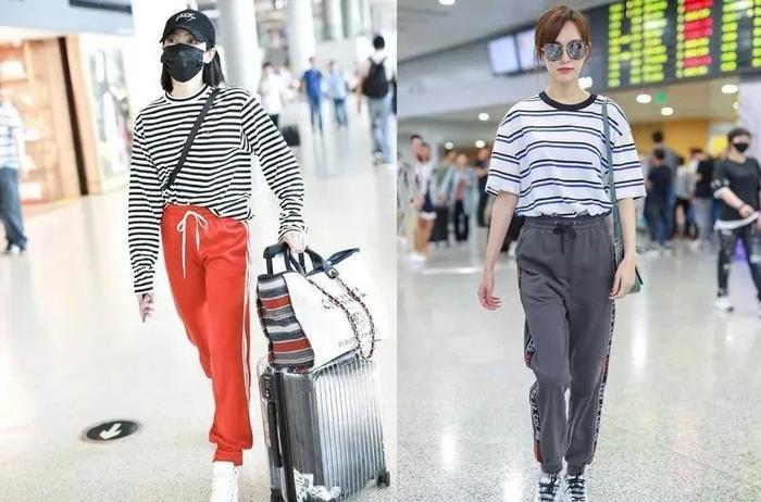 ♦条纹T恤的穿搭,休闲舒适的出街,还有就是和运动裤的组合,黑白条纹T恤和红色运动裤组合,选搭白色帆布鞋。还有就是蓝色条纹T恤和深灰运动裤组合穿搭,选择白色的包包和运动鞋搭配,