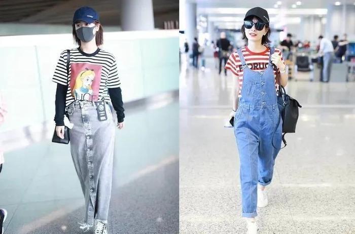 ♦简单的黑白条纹T恤(卡通图案印花)选搭裙装时,上图一中的长款灰色牛仔裙,推荐休闲穿搭。还有就是可爱的造型选搭,红色条纹T恤和浅蓝牛仔背带裤组合,青春减龄的穿搭组合,日常简单的搭配选择白色包包和鞋子,或者选择黑色调也可以。
