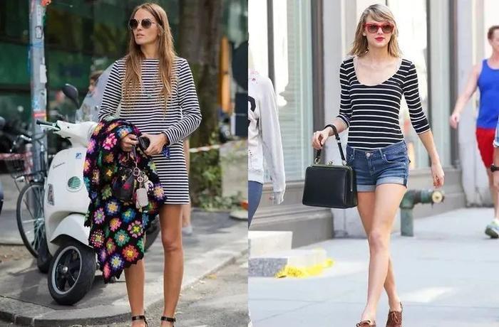 ♦简单的黑白条纹T恤,日常出街宽松的款式和深色紧身裤组合,简单的造型选搭。还有就是蓝色条纹T恤和浅蓝半裙搭配,休闲气质还优雅的造型,包包和靴子首选是黑色调,鞋子的颜色推荐尝试选择红色。