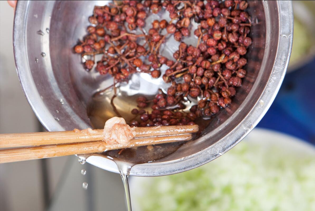 在最后,我们还需往饺子馅中,加上适量的料酒,这个料油是什么呢,其实就是各种调料炸出来的油。把葱姜、花椒、洋葱、香菜等调料放入油锅中,炸香之后晾凉,倒在肉馅中拌匀,香味更加浓郁。