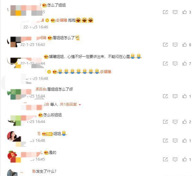网友们看到斓曦的异常行为,在底部问道:我妹妹怎么了?对此,斓曦目前没有回应。