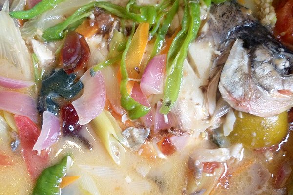 3. 康巴赫不粘锅用小火加热放油,待油温六成热下鱼煎至两面金黄,依次放入切好的西红柿,胡萝卜,洋葱,西芹,小火爆料出香味放入矿泉水淹至鱼身,大火开锅至汤变白色,转小火炖至金汤奶白色放入柠檬汁,皮蛋,薄皮辣椒,两分钟后调味出锅。