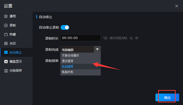 第二步:自动录制以及停止录制功能,这个功能很好的解决了我们在忙碌时无法进行录制的问题,设置录制的时长以及录制完成之后的操作,然后点击确定即可。