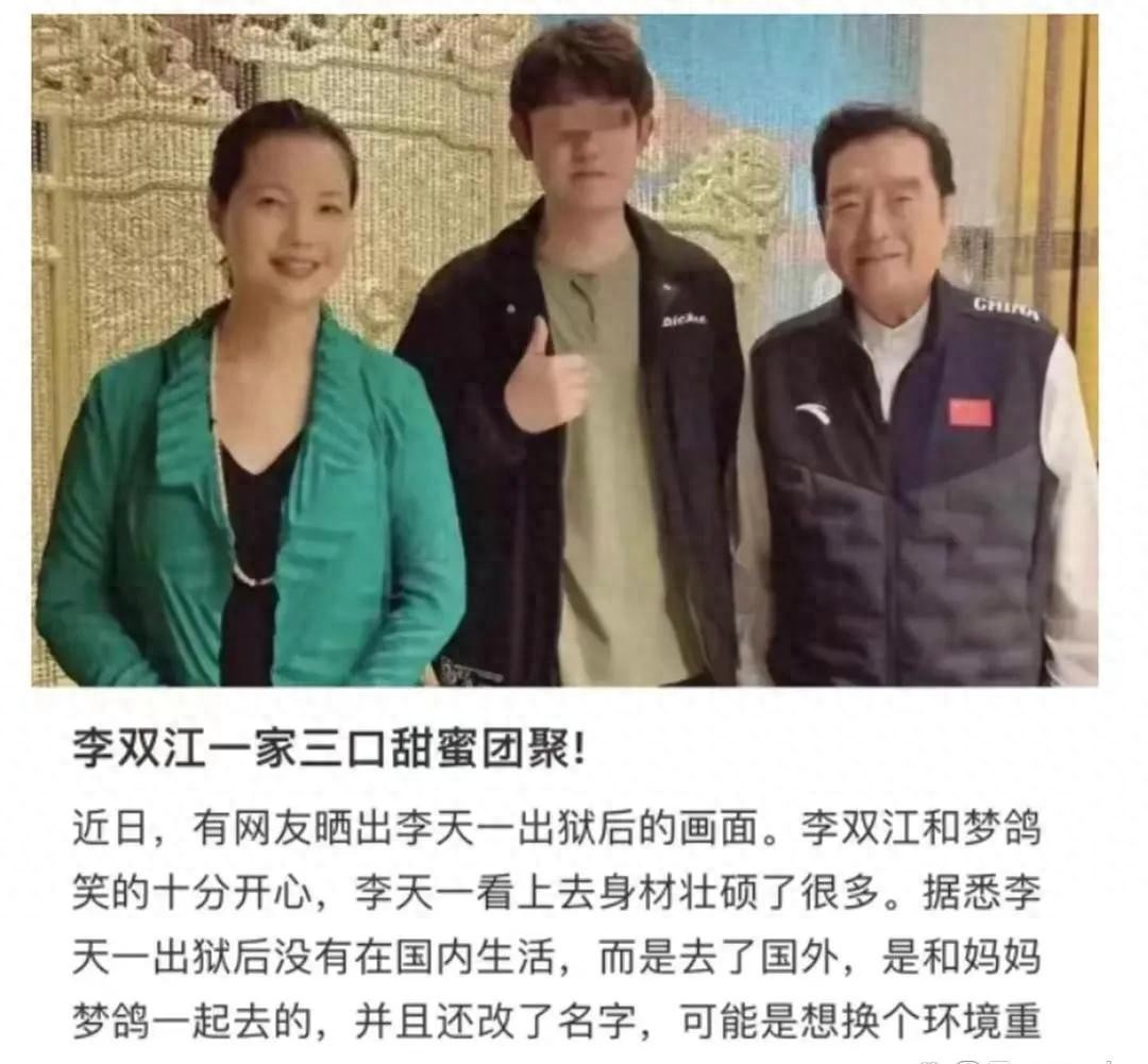 前不久,一张李天一出狱的全家福照片,火了。图片中,李天一站在李双江和梦鸽中间,他的眼睛也被马赛克处理过,右手并竖着一个大拇指。