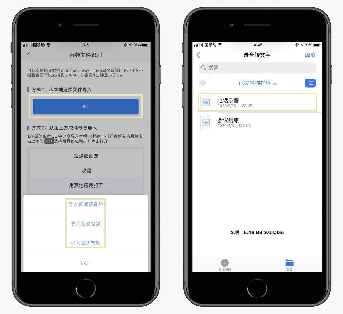 我们选择导入外部音频功能,进入后点击【浏览】,在下方选择音频的语言,然后打开本地文件夹,找到电话录音文件,直接点击就能快速进入转换中。