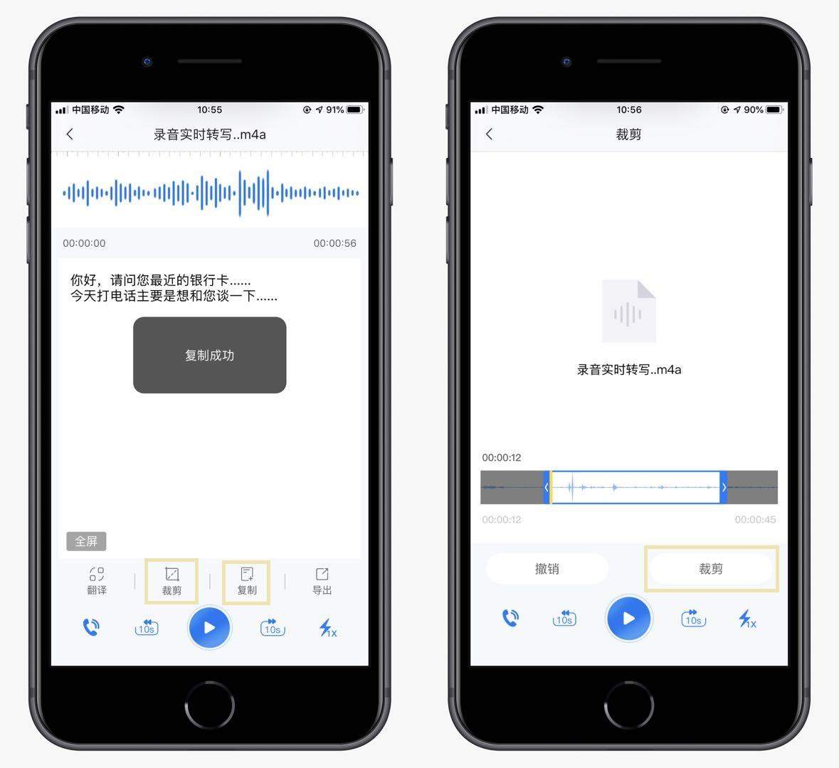 稍等5秒左右,就能将通话录音转换成文字了,点击【复制】按钮提取文本内容,还能翻译文本;点击【裁剪】按钮,可以将重点部分裁剪下来,单独转为文字。