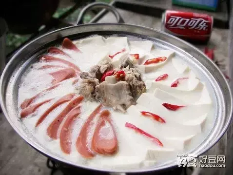 做法:1)黄豆用水泡12小时。2)将豆腐、南瓜、火腿肠切片,排骨煮熟,所有菜菜码入锅中。3)将黄豆加水磨成豆浆。4)豆浆过滤掉豆渣,倒入码好食材的锅中。5)将锅置火上调入油、盐、少量味精。6)待锅内煮开,将锅移至酒精炉上点火边炖边吃。