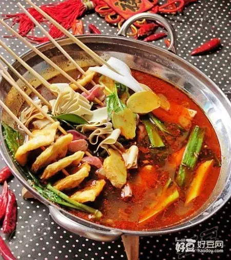 做法:1)准备好所有的食材。2)锅中烧开水加入少许盐,放入竹签煮上5分钟捞出洗净备用。3)海带煮上3分钟备用。4)所有食材全部切好,千张和油豆皮切宽条。5)鸡纯用开水焯烫备用。6)所有食材用竹签串好备用。7)炒锅中少倒一些油放入火锅底料小火炒至。8)直到火锅底料融化出香。9)加入适量的高汤或者清水。10)加入葱姜蒜。11)加入适量的料酒。12)在加少许生抽。13)加入少许白糖。14)加入少许黑胡椒粉和鸡精。15)大火煮上10分钟,煮出香味。16)把串好的食材放入一个小锅中17)煮好的汤汁倒入,把小锅和酒精炉一起上桌,随吃随煮即好。