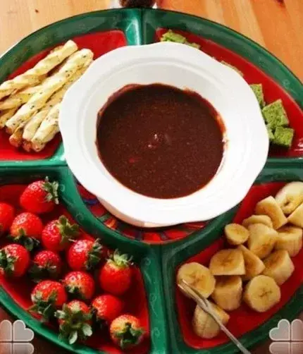 做法:1)在准备融化巧克力的容器里放一点黄油,然后把巧克力放到容器中,下面点根蜡烛慢慢融化它们。如果不喜欢味道太苦的巧克力,可以在里面加一大勺鲜奶油。也可以先将巧克力隔水加热,然后再用蜡烛保持温度。这样做巧克力溶液会更丝滑 2)巧克力融化的时候,可以准备其他物品,比如蛋糕切成块3)草莓用盐水浸泡10分钟后,捞出。用厨房纸巾蘸干水份,不用去蒂,这样不仅漂亮而且可以直接用手捏着蒂去蘸巧克力,吃着方便 4)芝麻阿拉棒装盘。不想自己烤饼干的可以去超市选购,建议买长条形状的饼干。我第一次次做巧克力火锅的时候竟然烤了一盘圆球状的饼干,饼干可不像蛋糕可以用叉子,饼干只能用手拿,结果朋友们用圆球饼干蘸完巧克力之后还得舔手指头5)香蕉去皮,中间的线也要去掉,然后切块,香蕉不能太熟,要硬一点的~~