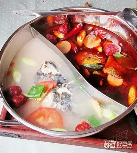做法:1)准备好所有的食材。2)鱼头洗净放入不粘锅煎至。3)煎至两面金黄关火。4)汤锅加热放入葱姜。5)再放入半个鱼头。6)冲入适量的开水。7)加少许白酒煮至鱼塘奶白,加盐,胡椒粉调味成为白汤备用。8)准备好红汤的调味料。9)锅中油烧热放入火锅底料炒出香味。10)再放入葱姜蒜辣椒爆香。11)加入适量清水。12)加入料酒。13)加入盐。14)加入白糖。15)煮上5分钟出香加入鸡精。16)放入另外半个鱼头煮上5分钟。17)然后把红汤和白汤分别盛入鸳鸯火锅中,加入红枣,胡萝卜片,番茄片,枸杞。18)随酒精炉和配菜一起上桌边煮边加入配菜。
