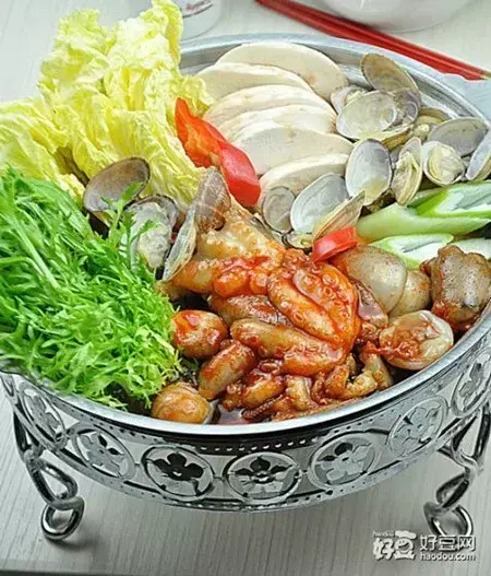 做法:1)章鱼洗净。2)切块,放入韩式辣椒酱、白糖、盐、生抽腌渍。3)锅子烧开水,放入蛤喇,煮开。4)将口蘑片、苦菊、娃娃菜和大葱码在锅内。5)放上腌渍的章鱼和煮开的蛤喇。6)锅子放水,放入耗油、鸡精,煮开。7)将汤汁倒入锅内,点燃酒精。盖盖子,煮开,就可以吃了。