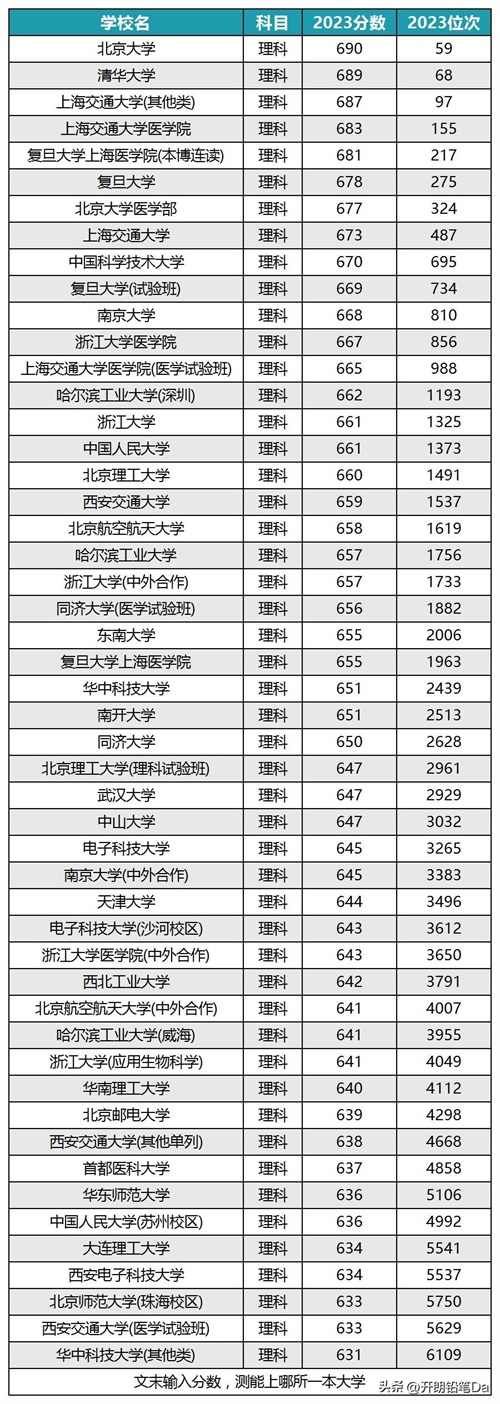一本最难考的三所大学:北京大学690分、清华大学659分、上海交通大学(其他类)687分,这三所大学的最低位次排名在一百以内。下面是理科一本院校录取分最高的50所大学名单。