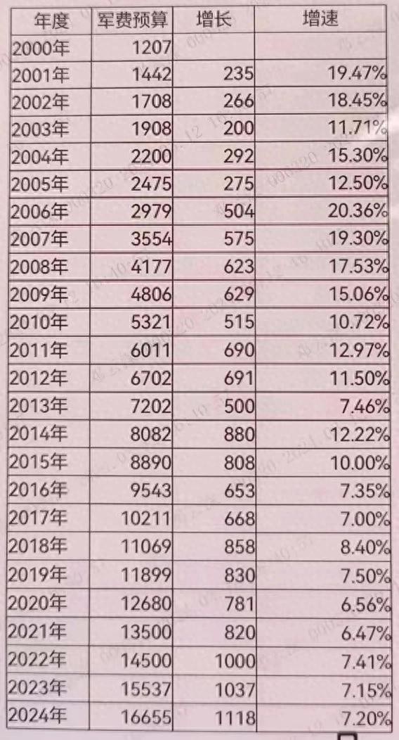 虽然军费增速放缓了,但绝对数字上来了,2024年中国军费16655亿元,是2000年的13倍还多。