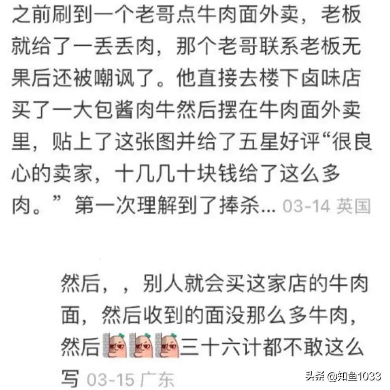 之前刷到一个老哥点牛肉面外卖,老板 就给了一丢丢肉,那个老哥联系老板无果后还被嘲讽了。他直接去楼下卤味店买了一大包酱肉牛然后摆在牛肉面外卖里,贴上了这张图并给了五星好评“很良心的卖家,十几几十块钱给了这么多