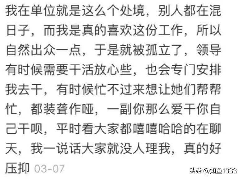 我在单位就是这么个处境,别人都在混日子,而我是真的喜欢这份工作,所以自然出众一点,于是就被孤立了,领导有时候需要干活放心些,也会专门安排我去干,有时候忙不过来想让她们帮帮忙,都装聋作哑,一副你那么爱干你自己干呗,平时看大家都嘻嘻哈哈的在聊天,我一说话大家就没人理我,真的好压抑
