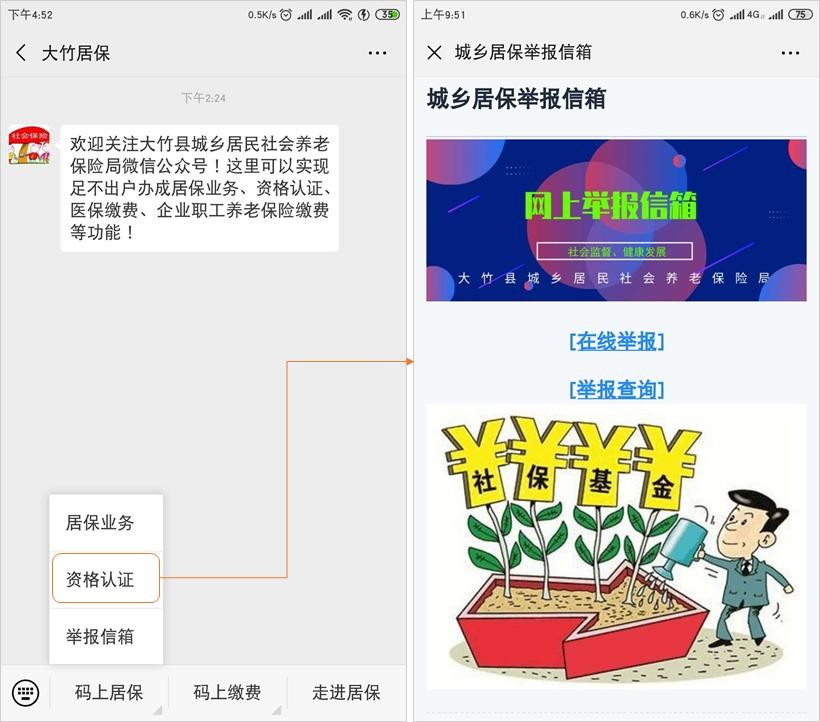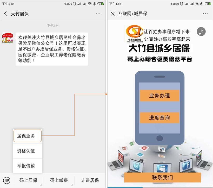 具体操作:手机关注“大竹居保”,打开居保业务,即可开始办理业务、查询业务进度: