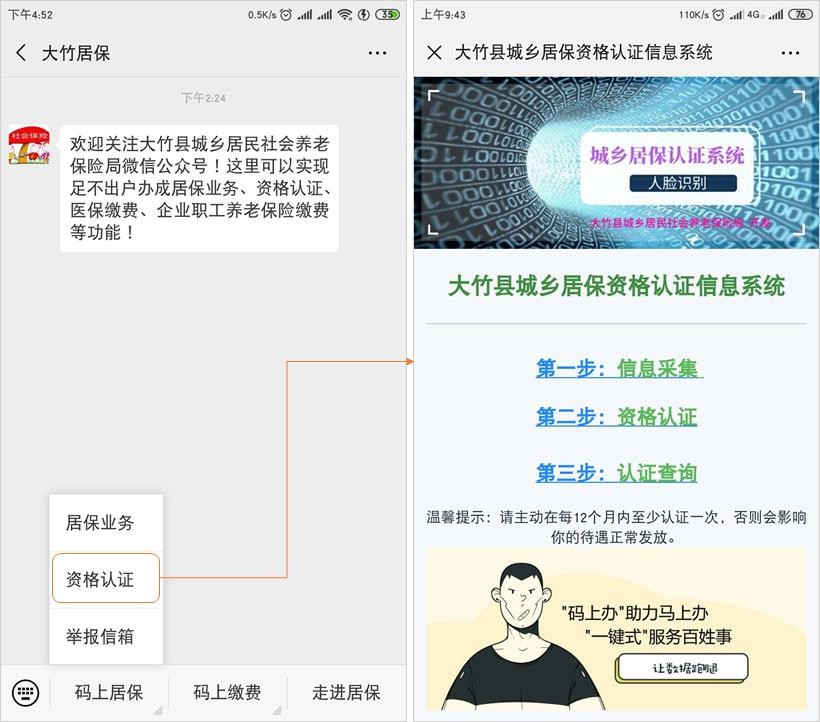 具体操作:手机关注“大竹居保”,打开资格认证,完成基础信息采集后,即可进行身份验证:
