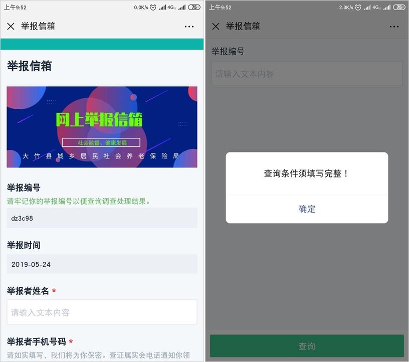 点击在线举报、即可录入举报信息(下图左);当举报人需要查询处理进度时,在举报信箱填入举报编号即可。