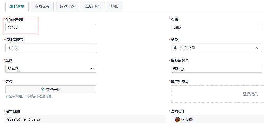 设置了一个“前端事件”,当填写好检查的车辆自编号后,自动调取API接口的数据,返回线路、驾驶员姓名、职号、单位和车队的信息,极大地方便了稽查人员。