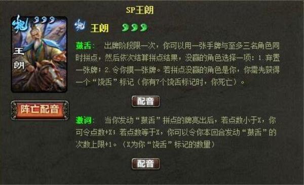 今天小编为大家带来三国杀超强的八人军争武将王朗的解析。去年王司徒一上线,小编就马上前去围观,然后听到王朗的台词后瞬间笑喷,真的非常具有喜感啊!王朗是边锋三国杀在去年2.79版本更新后推出的,当时拥有“中流砥柱”战功的大佬获得了王司徒的七天免费试用权,活动结束后,王朗并没有登录商城,所以王司徒现在已经再也见不到了。