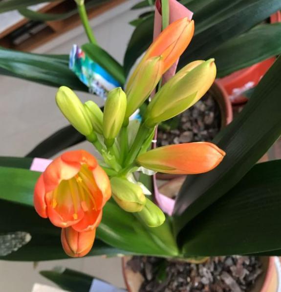 君子兰出来花苞,第1点必须要多见光,因为光照充足了以后,叶片进行光合作用进行的好,光合作用进行的好,养分回流到根系上,根系长得好,根系长好了以后,吸收养分充足,才能够让他的花剑快速的长高,快速的把花开起来。